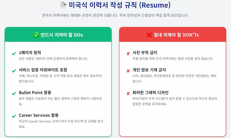 미국식 이력서는 한국식과 다릅니다. 사진, 나이, 주민번호는 절대 넣지 않습니다. 1페이지를 원칙으로 하고, 관련 경험을 bullet point로 간결하게 정리합니다. 서비스 업종 아르바이트 경험(카페, 레스토랑, 리테일 등)이 있다면 반드시 포함하세요. 고객을 직접 응대한 경험은 호텔 인턴십 지원에서 중요하게 평가됩니다. 학교 Career Services 오피스에서 무료로 이력서 피드백을 받을 수 있으니 적극 활용하세요.