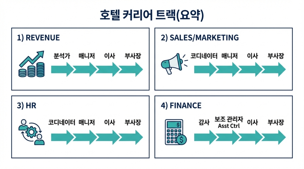 Finance 트랙은 Income Auditor → Assistant Controller → Director of Finance → VP of Finance 순입니다. 호텔 회계와 재무는 일반 기업 회계와 다른 특수한 부분이 있어서 이 분야 전문가는 업계 내 이동성이 높습니다.